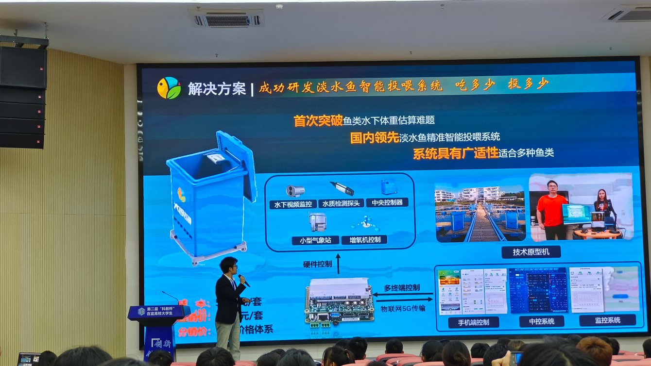 2023年6月4日,由共青团宜宾市委、中共宜宾市委人才和大学城工作局、宜宾市科学技术局、宜宾市科教产业投资集团有限公司、宜宾市学生联合会主办,西华大学宜宾校区党工委(管委会)承办的第二届“科教杯”在宜高校大学生创新创业竞赛决赛在西华大学宜宾校区举行。宜宾8所高校的16支参赛团队进入决赛,我院水产学院《大智若渔——国内首创水产养殖精准饲喂系统集成解决方案》项目在比赛中脱颖而出,荣获数字乡村和农村数字化发展类项目一等奖。