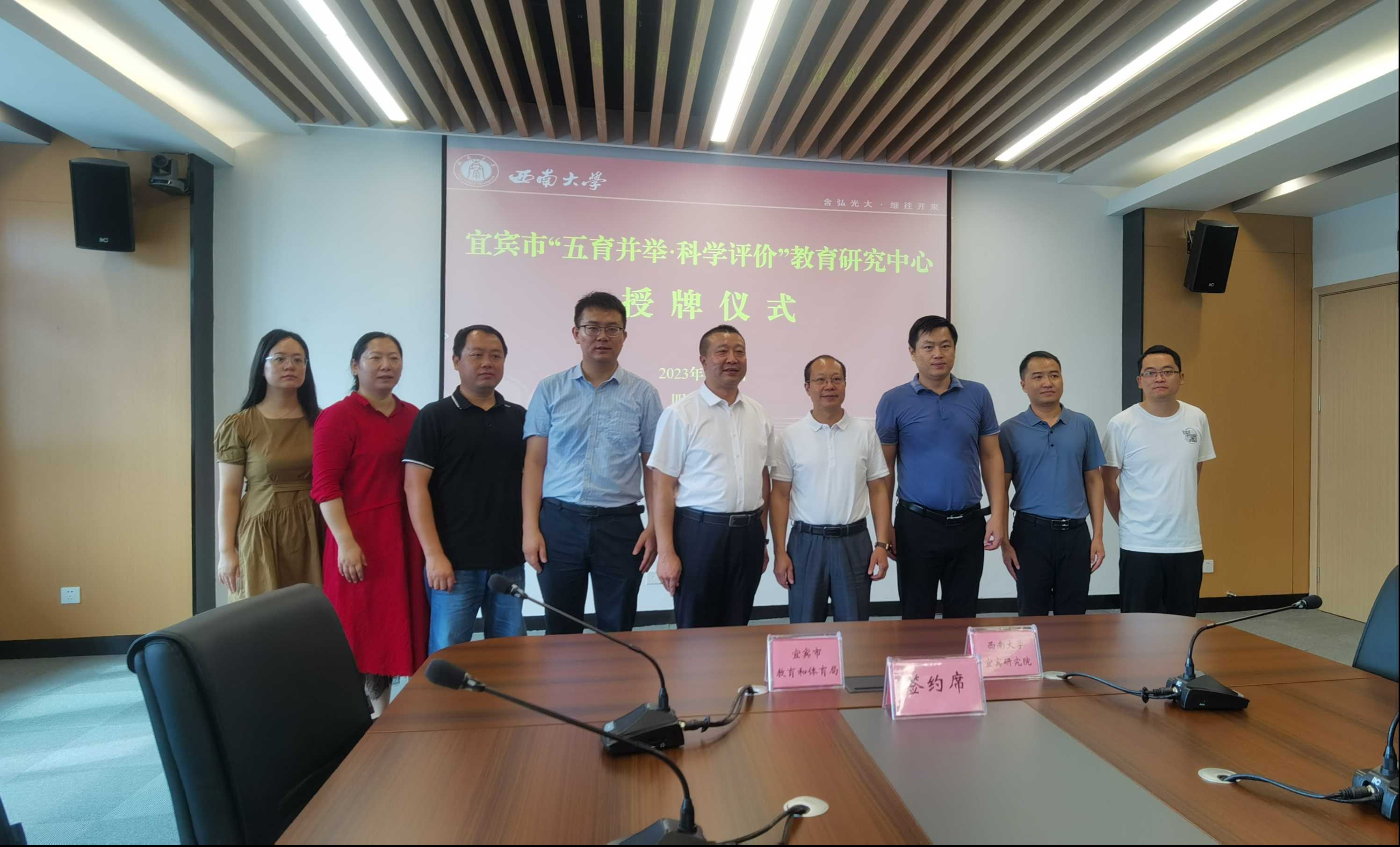 签约仪式上,双方签署了合作协议,授予PA视讯集团宜宾研究院为“宜宾市‘五育并举·科学评价’教育研究中心”,并合影留念。下一步,双方将本着“资源共享、优势互补、合作共赢、助力发展”的原则,共享优质资源、共建合作平台、共育教育人才,进一步搭建川渝基础教育深度合作平台,主动融入川渝教育协同发展计划,为持续推进宜宾教育高质量发展不懈努力。