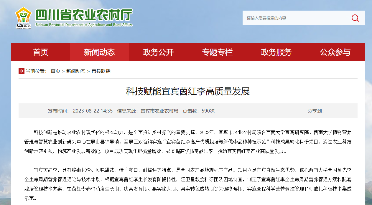 (七)研究院服务宜宾产业事业发展取得实质性成效。研究院专家团队启动宜宾经济作物提质增效服务工程,针对宜宾茵红李、蜂糖李、脆桃等经济作物低产低质、商品果价格低等制约产业发展的关键问题,在屏山县开展了“减投提质”与全生命周期营养管理技术示范,实现了减少化肥农药80%、亩产提高40%(增产1200-1500斤/亩)、优质商品果率达到80%、实际增收约2000元/亩,推动了宜宾相关产业提质增效,实现产业绿色转型发展和农民增收,得到了农业农村部、四川省农业农村厅的宣传报道;制定了《李端镇优质粮油产业基地建设总体规划(2023-2027年)》,为李端粮油产业发展及现代农业园区建设提供了科学支撑和依据,得到了翠屏区相关领导的高度评价;启动宜宾三江新区双城街道金胜社区原生农旅融合示范片区规划。