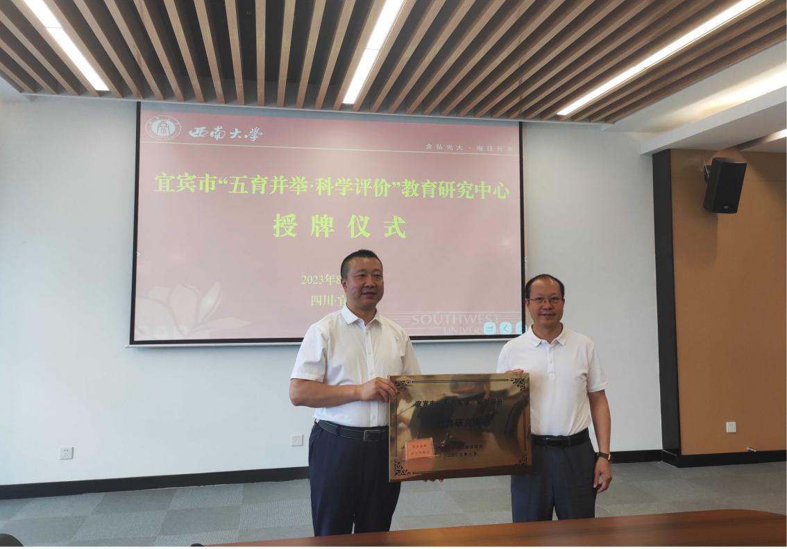 (三)与宜宾市教体局签订校地深度合作协议。8月3日,宜宾市教育和体育局与研究院举行校地战略合作签约,以及“宜宾市‘五育并举·科学评价’教育研究中心”授牌仪式。双方主动融入川渝教育协同发展计划,共谋教育发展新篇章。