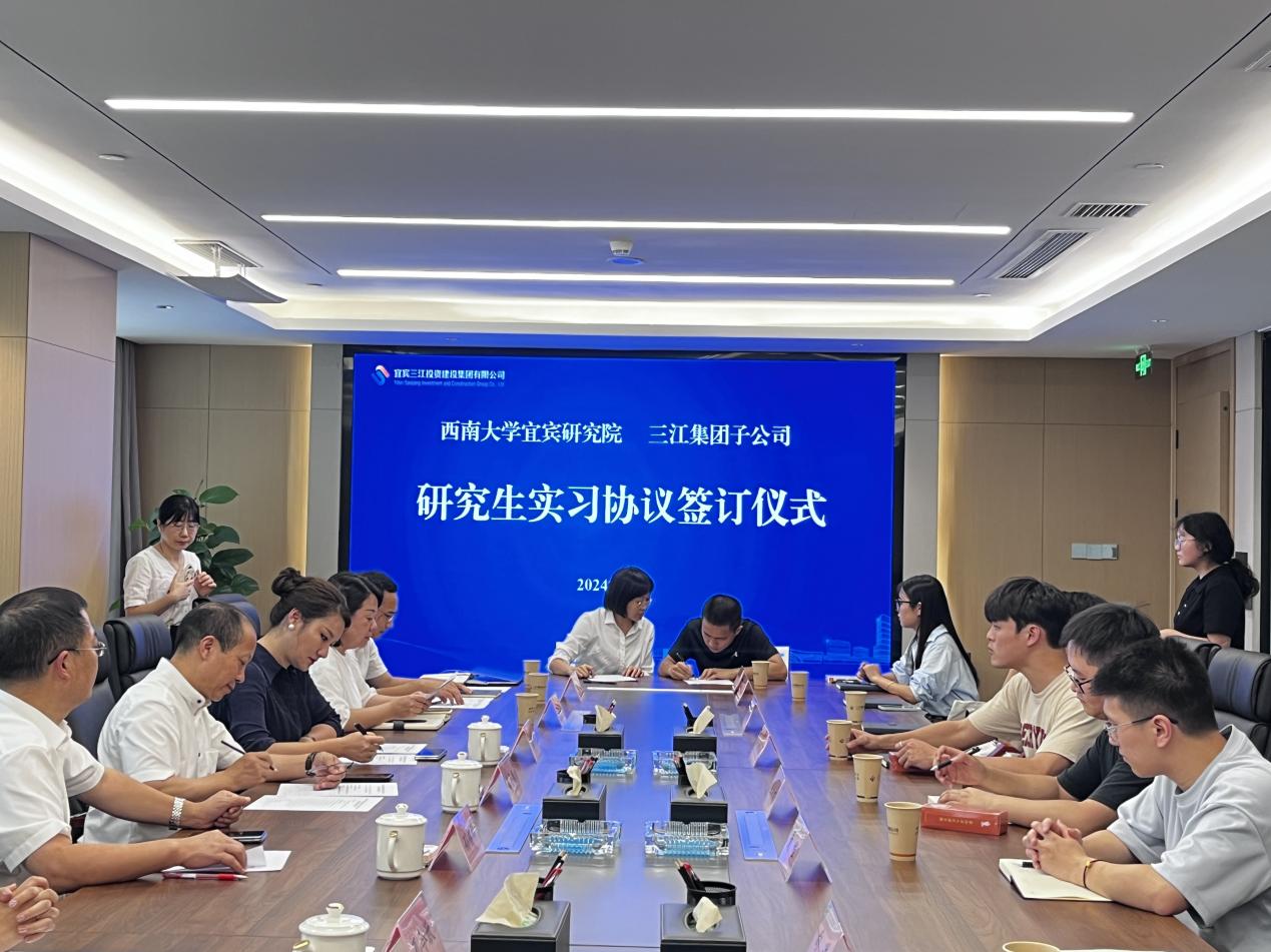 会上,播放了三江集团宣传片,介绍了三江集团的总体概况和基本产业。接下来,三江集团各子公司与参加实践学生签订了实习协议,并对学生们进入三江集团实践表示了热烈欢迎。随后,研究生代表冯瑞波、曲鑫发言,对三江集团和研究院提供的实践机会表达了感谢,介绍了自己的专业情况及对岗位的认识,表示将以饱满的热情和积极的态度投入到工作中,为公司的发展贡献自己的力量。