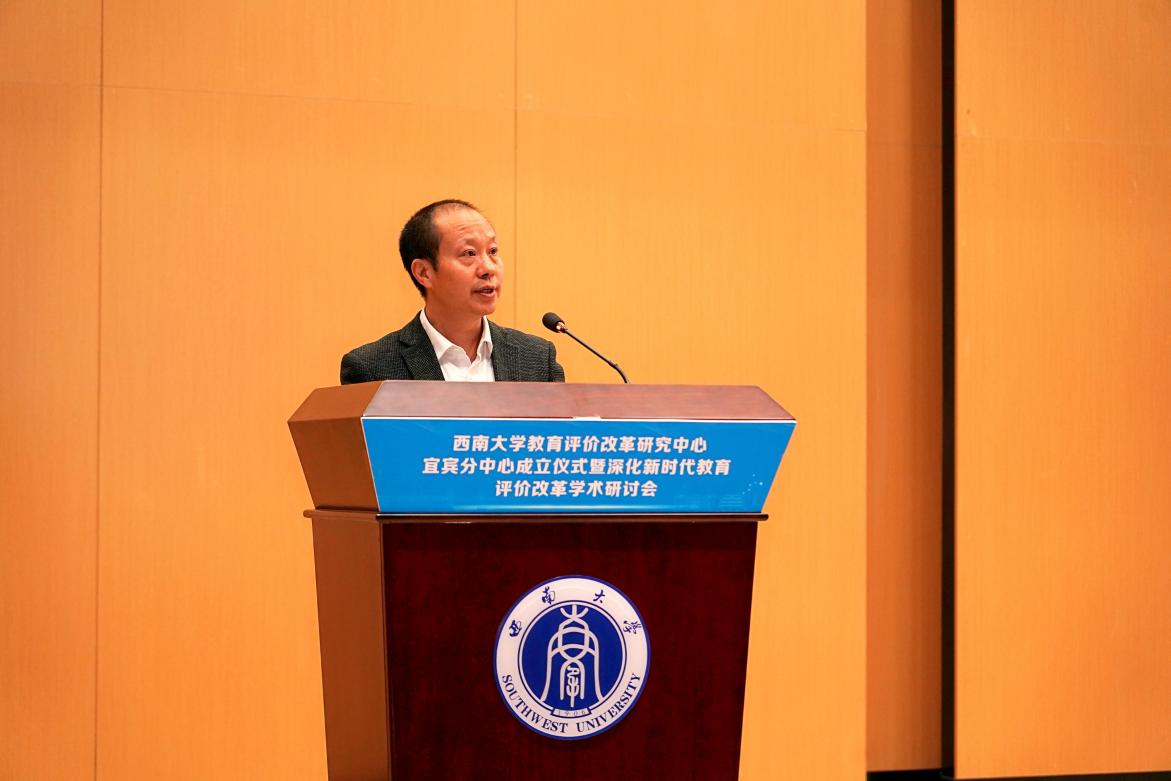 会议第一阶段宜宾分中心成立仪式由学校发展规划与学科建设部副部长杜彬恒主持。田贵荣在致辞中对宜宾分中心的成立表示热烈祝贺,他指出宜宾分中心的成立,将为宜宾教育评价改革实践提供强有力的智力支持和决策参考,将为宜宾基础教育高质量发展注入新的动力。