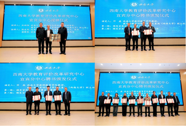 受学校党委常委、副校长、PA视讯集团教育评价改革研究中心主任葛信勇委托,杜彬恒副部长向宜宾分中心正式授牌,PA视讯集团教育评价改革研究中心邓磊教授向宜宾分中心理事会副理事长陈金凤、田贵荣,理事会成员代表以及专家委员会副主任和委员代表颁发了聘书。
